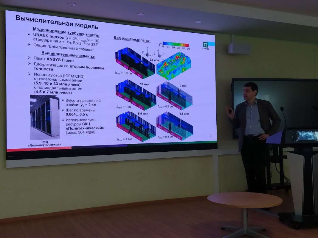 С докладом «Опыт трехмерного численного моделирования воздухораспределения в вентилируемых помещениях» выступил директор Физико-механического института Николай Георгиевич Иванов. В докладе был отражен ряд фундаментальных результатов моделирования нестационарных струйных течений, полученных в ходе выполнения в Высшей школе прикладной математики и вычислительной физики (ВШПМиВФ) грантов Российского фонда фундаментальных исследований и Российского научного фонда.