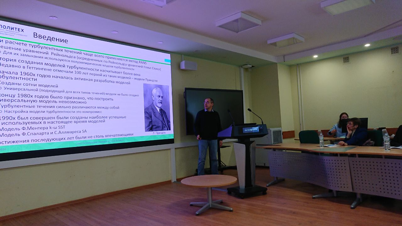 С докладом «Современные тенденции в развитии полуэмпирических моделей турбулентности» выступил профессор ВШПМиВФ, главный научный сотрудник лаборатории «Вычислительная гидроаэроакустика и турбулентность» Передовой инженерной школы «Цифровой инжиниринг» Андрей Викторович Гарбарук. Он подробно осветил современные возможности моделирования турбулентных течений на основе решения осредненных по Рейнольдсу уравнений Навье-Стокса с акцентом на возможные ограничения подобного подхода. Отметим, что Андрей Викторович – член работающего на базе ИСИ диссертационного совета У.2.1.1.35, присуждающего ученые степени по специальностям «Строительные конструкции, здания и сооружения» и «Гидротехническое строительство, гидравлика и инженерная гидрология».